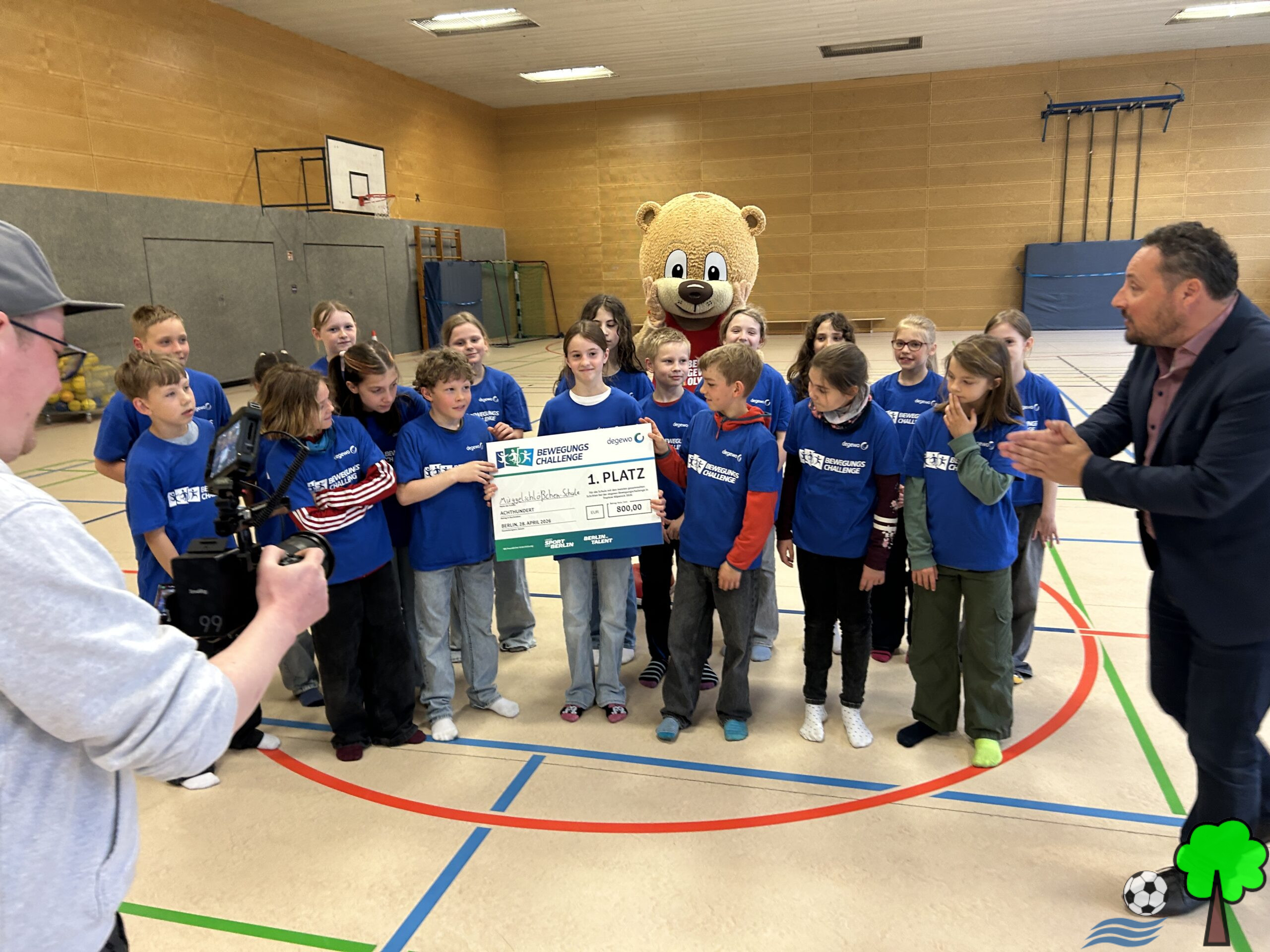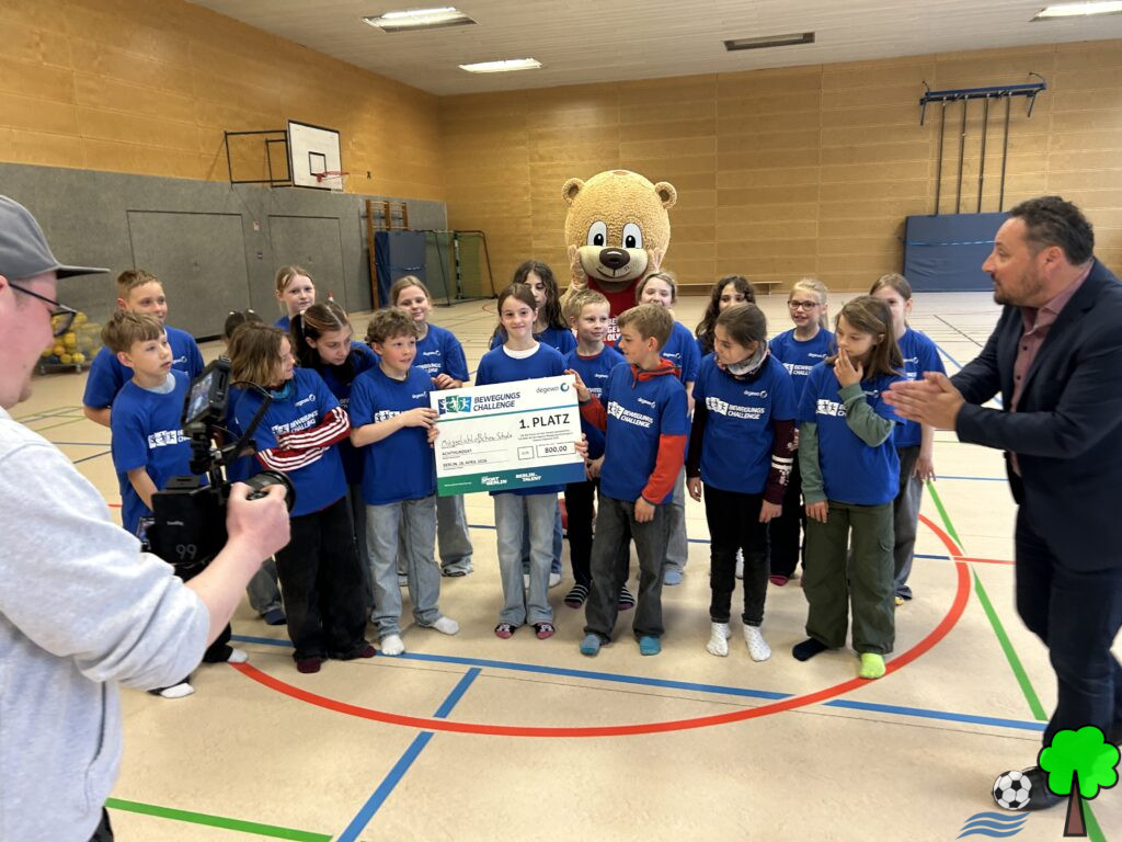 Am Freitagnachmittag kam dann der Anruf in der Schule, dass die meisten Schritte in Treptow-Köpenick von unseren Schülerinnen und Schülern absolviert wurden, bevor am Montag darauf auch gleich ein Filmteam zur Preisübergabe anrückte. Berlino, das Maskottchen des Landessportbundes und der Leiter der Sportjugend Berlin übernahmen die Übergabe des Gewinnerschecks. Satte 800€ konnten unsere Schülerinnen und Schüler erlaufen.