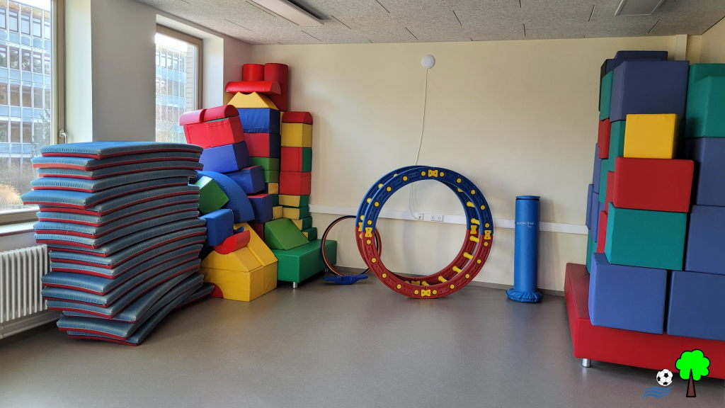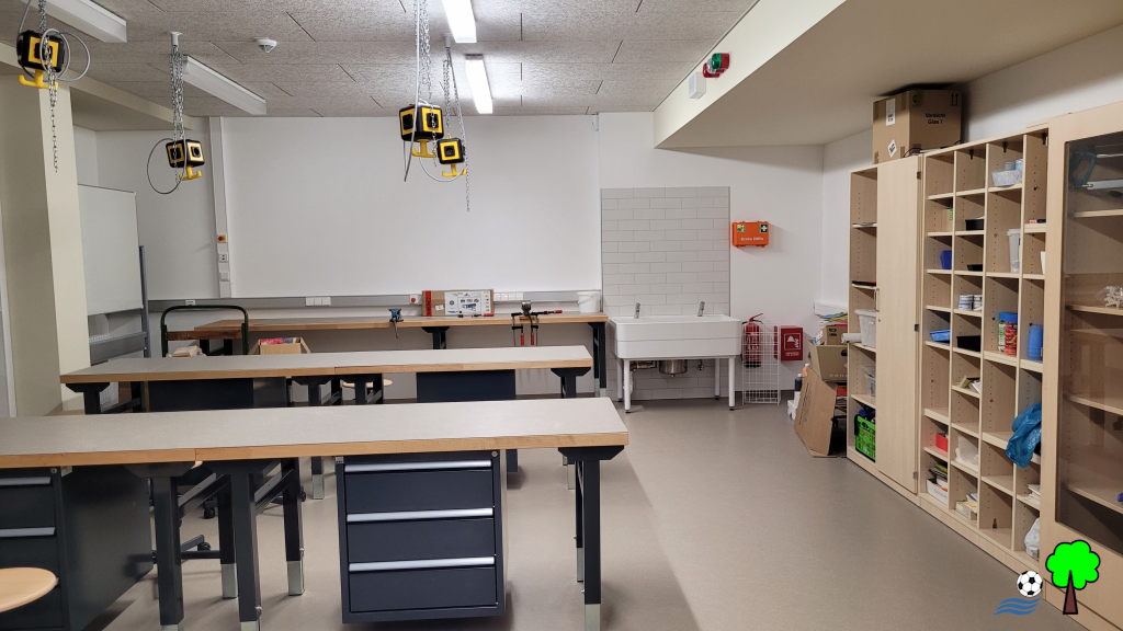 Dazu werden die Klassenräume sowie die Turnhalle genutzt. Außerdem gibt es Beschäftigungsmöglichkeiten in anderen Funktionsräumen wie z.B. die Kreativwerkstatt, den Musikraum, Bewegungsraum, die Bibliothek und die Kinderküche.